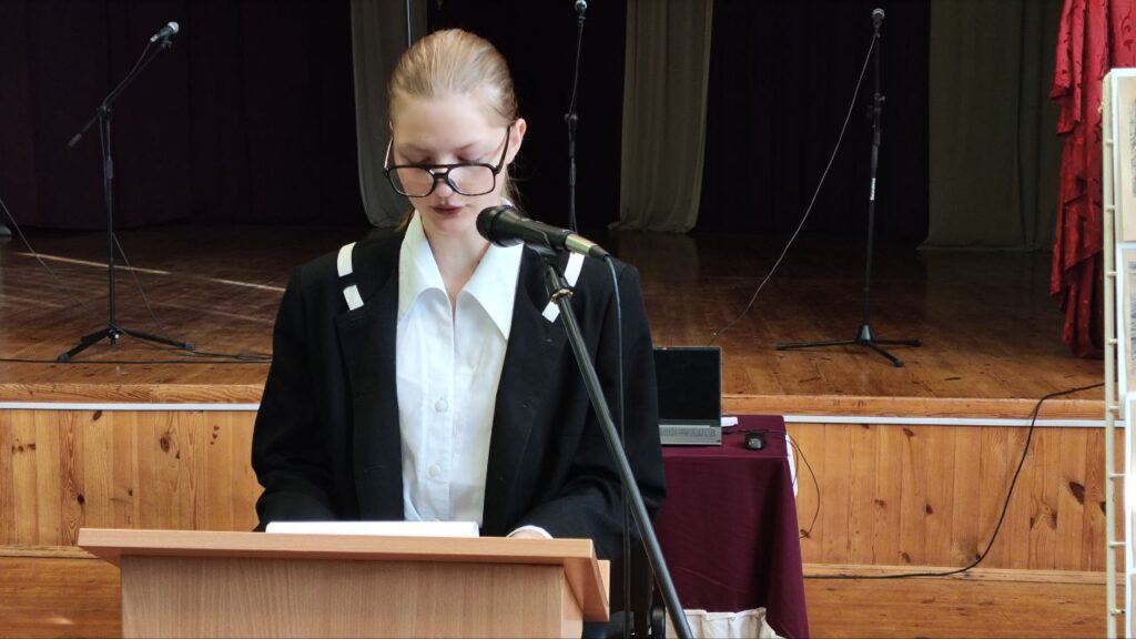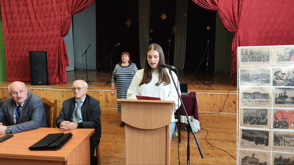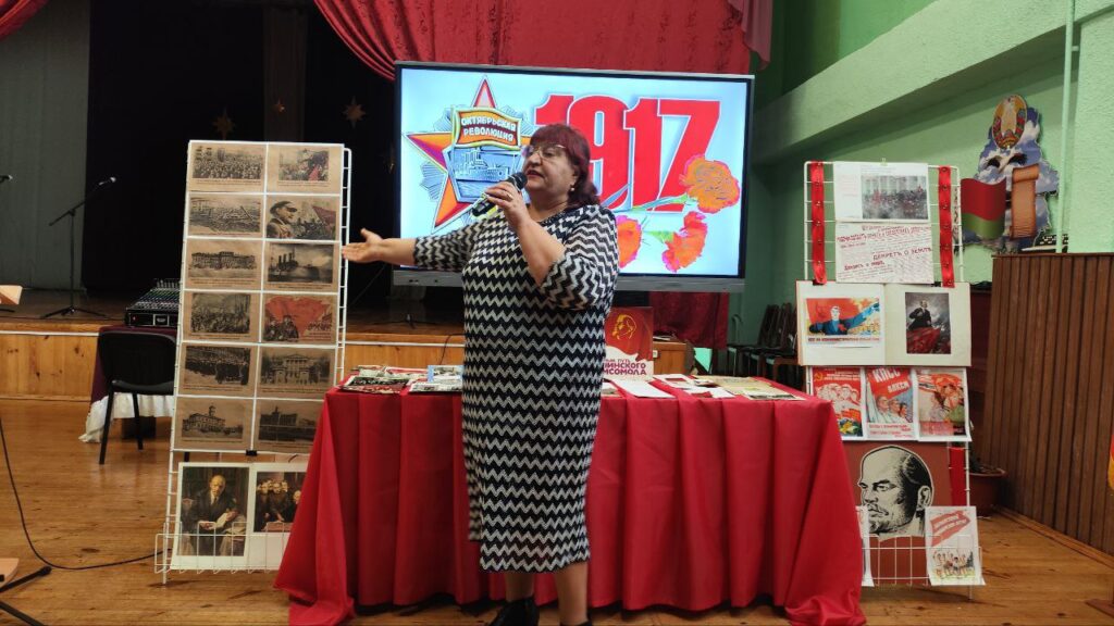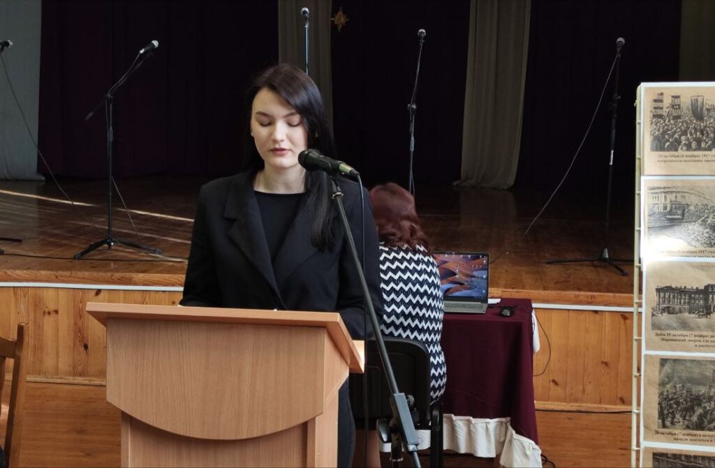 Модераторы мероприятия Вероника Зубрей, Карина Бельскис и Анастасия Бондаренко информировали о причинах и итогах Октябрьской революции, её роли в становлении белорусской государственности.