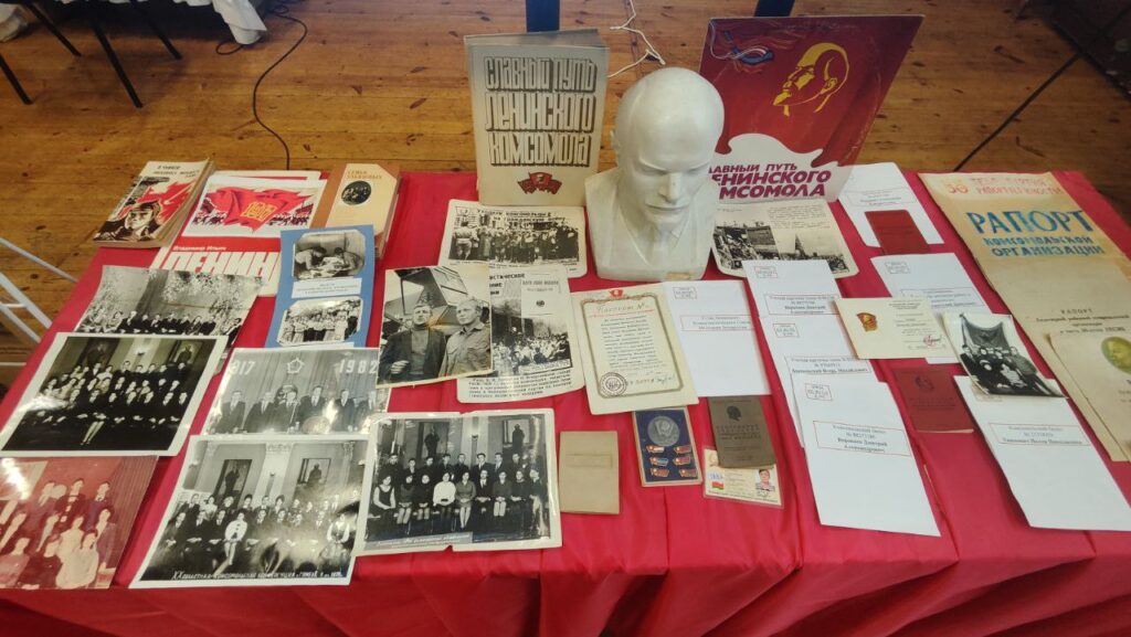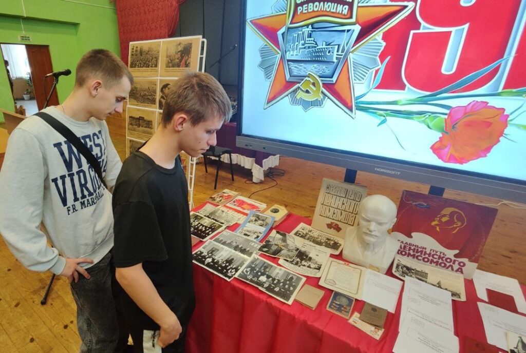 Л.А. Шруб провела обзор выставки, подготовленной библиотекарем Павлечко И.В., на которой были выставлены очень интересные материалы: бюст В.И. Ленина, этапы и итоги революции, знамя ВЛКСМ, значки ВЛКСМ, «Комсомольский прожектор», фотографии районной комсомольской организации, рапорты, членские билеты, книги, альбомы…